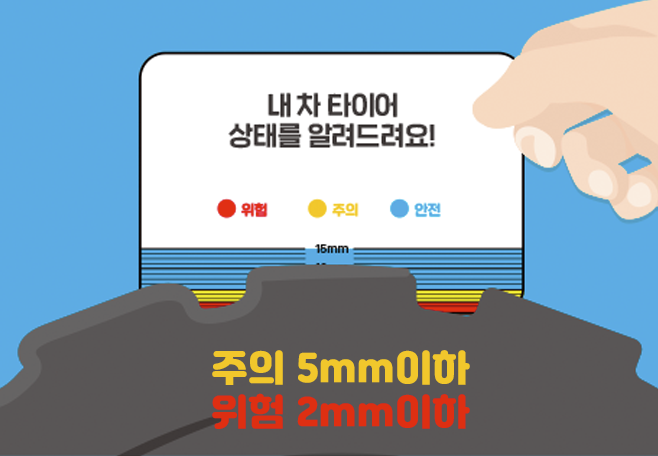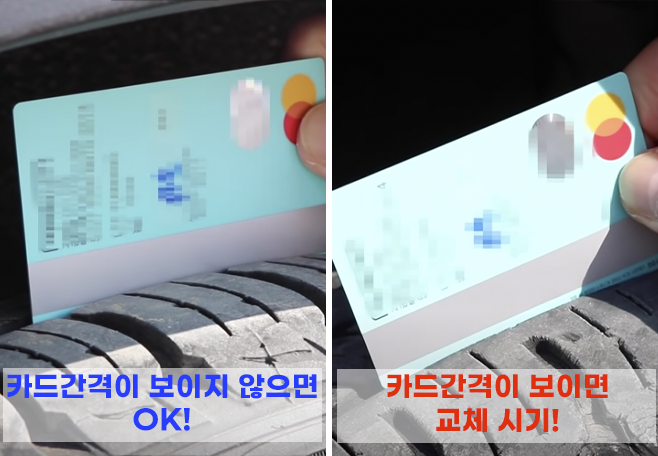 카드를 타이어 홈에 끼워 마그네틱과 카드 끝의 간격이 보이지 않으면 아직 타이어를 교체하지 않아도 되지만, 카드 간격이 타이어 트레드 위로 올라온다면타이어가 3~4mm 정도 밖에 남지 않은 것으로 교체가 필요합니다.