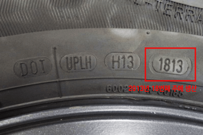 타이어 제조일자는 타이어 옆면에서 확인이 가능합니다. 4자리 숫자의 앞 2자리는 생산 주차, 뒤 두 자리는 생산연도로 사진의 타이어는 2013년 18번째 주차에 생산되었습니다. 거의 10년이 다 되어가는 타이어니 반드시 교체해야겠죠?