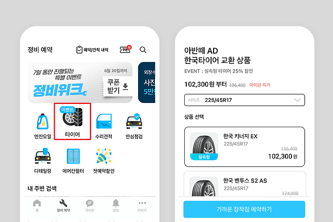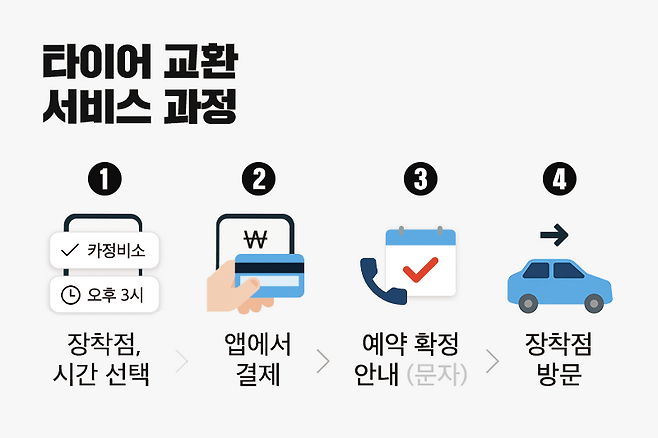 이럴 땐 주변에 양심 업체에 예약하고 타이어 교체가격까지 미리 결제하고 가는 앱 서비스를 사용하시는 걸 추천드립니다.