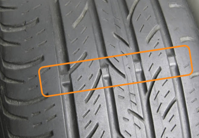 타이어 홈 안쪽에 튀어나와있는 마모한계선이 양옆 트레드와 비슷한 높이라면 타이어를 교체해 주셔야 할 때입니다.