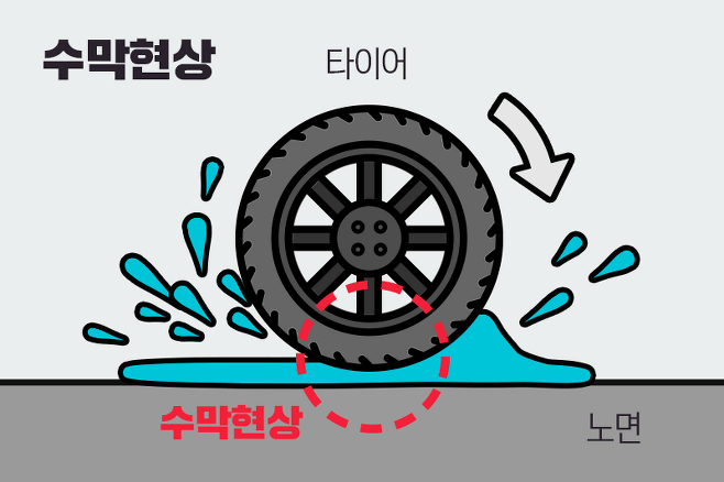 이는 바로 마모된 타이어에서 발생하는 수막현상 때문인데요. 수막현상은 비에 젖는 노면을 달릴 때 타이어 홈 사이로 빠져나가야 할 물이 제때 빠져나가지 못해 수막이 생기는 현상을 말합니다. 마모된 타이어를 계속해서 사용하다간, 위험한 순간에 차가 제때 서지 못하는 불상사가 일어날 수 있죠.