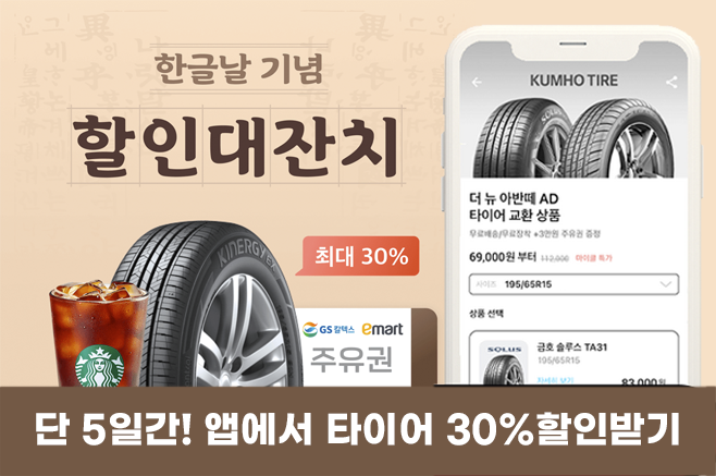 이번 주까지 마이클 앱에서 한글날을 기념으로 타이어를 최대 30%까지 할인하는 이벤트를 진행 중이니, 이번 기회에 현명하게 타이어를 교체해보세요!