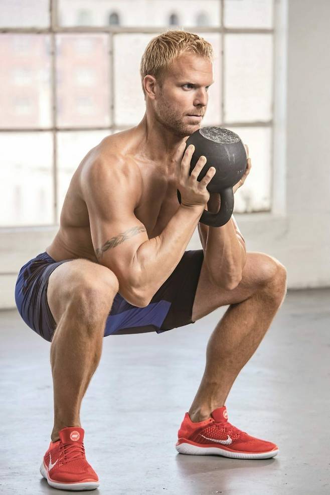 케틀벨을 고블릿 자세로 쥐고 서자(양손으로 케틀벨을 잡고 턱 바로 아래에 위치시키면 된다). 양발은 어깨너비보다 넓게 벌리자. 등을 평평하게 유지한 상태에서 넓적다리가 바닥과 평행을 이룰 때까지 스쿼트로 몸을 낮추자. 그런 다음 무릎과 엉덩이를 펴서 다시 일어서자.