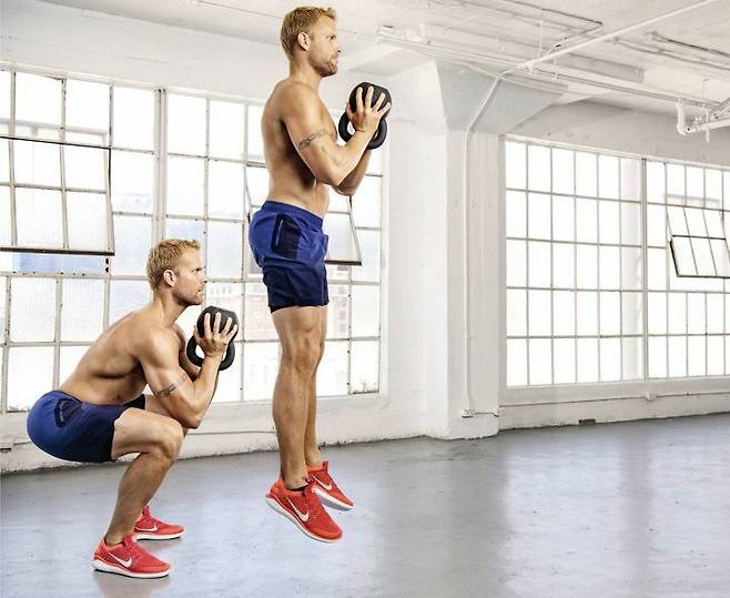*칸의 한마디: “난 케틀벨 스윙으로 엉덩이를 단련하고, 그 힘으로 스쿼트를 수행하는 걸 좋아합니다. 그리고 점프 스쿼트 마지막에 플라이오메트릭을 추가하면 운동 후에도 지방을 연소시키는 데도움이 됩니다.”