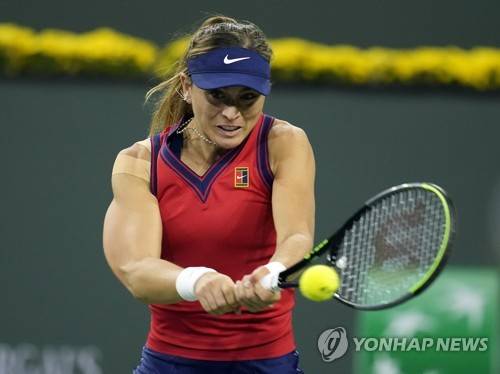 epa09526476 Paula Badosa of Spain in action against Ons Jabeur of Tunisia at the BNP Paribas Open tennis tournament at the Indian Wells Tennis Garden in Indian Wells, California, USA, 15 October 2021. EPA/RAY ACEVEDO