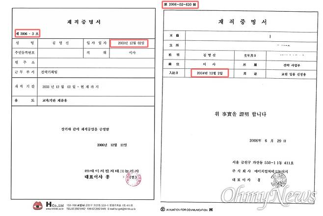 | ▲ 김건희씨가 2006년 6월에 낸 폴리텍대(왼쪽)와 2006년 12월에 수원여대에 제출한 에이치컬쳐테크놀러지 재직증명서 |