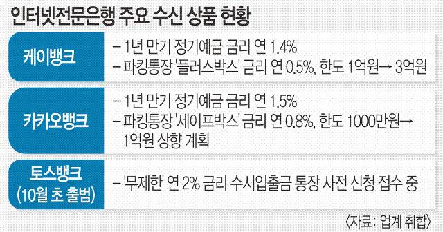 내달 초 토스뱅크의 출범으로 국내 인터넷전문은행이 세 곳으로 늘어나면서 이들의 수신(예금) 유치 경쟁이 본격화되고 있다.