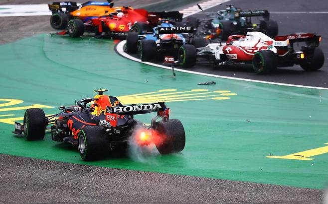 생각보다 이른 시점에 사고가 터졌다. 경기 시작 후 첫 번째 코너에서 브레이크가 잠긴 발테리 보타스가 맥라렌 소속 랜도 노리스의 뒤를 들이받았다. 이후 막스 베르스타펜과 세르지오 페레즈까지 충돌에 휘말려 경주차가 큰 충격을 입었다. 사고의 여파로 보타스와 페레즈, 노리스가 경기를 포기했으며, 페라리의 샤를 르클레르와 애스턴 마틴의 랜스 스트롤도 서로 간의 충돌로 리타이어했다.