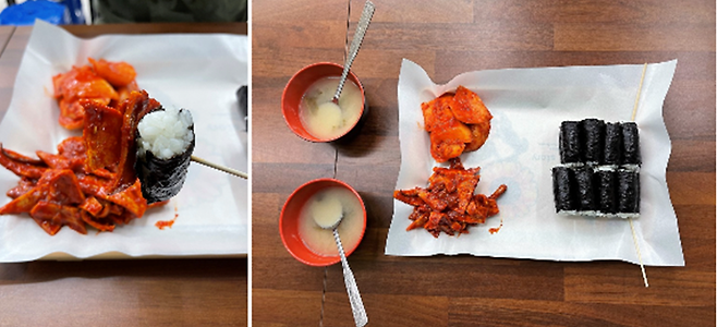 주문하면 먼저 뜨끈한 시래깃국을 한 그릇씩 내어준다. 김과 밥 만으로 만든 김밥과 빨간 어묵, 그리고 큼지막한 깍두기와 오징어무침이 한 접시에 나온다. 일반적인 깍두기와는 다르게 크게 썬 무김치는 ‘섞박지’라 불린다. 젓가락 말고 이쑤시개 같은 나무 꼬치로 김밥과 반찬을 꽂아서 먹는다. 아주 기가 막혀 둘이 먹다 하나 죽어도 모를 맛은 아니다. 별 특징 없는 밋밋한 맛인데, 뒤돌아서면 이상하게 ‘섞박지’가 생각난다. 고추장이 듬뿍 묻은 오징어도 왠지 모를 매력 덩어리다. 김밥이 아니라 ‘금밥’이냐는 고가 논란이 있다. 그런데도 이왕 통영까지 왔다면 한 번쯤 먹어보자는 심리가 작동해 꾸준히 팔리고 있다.