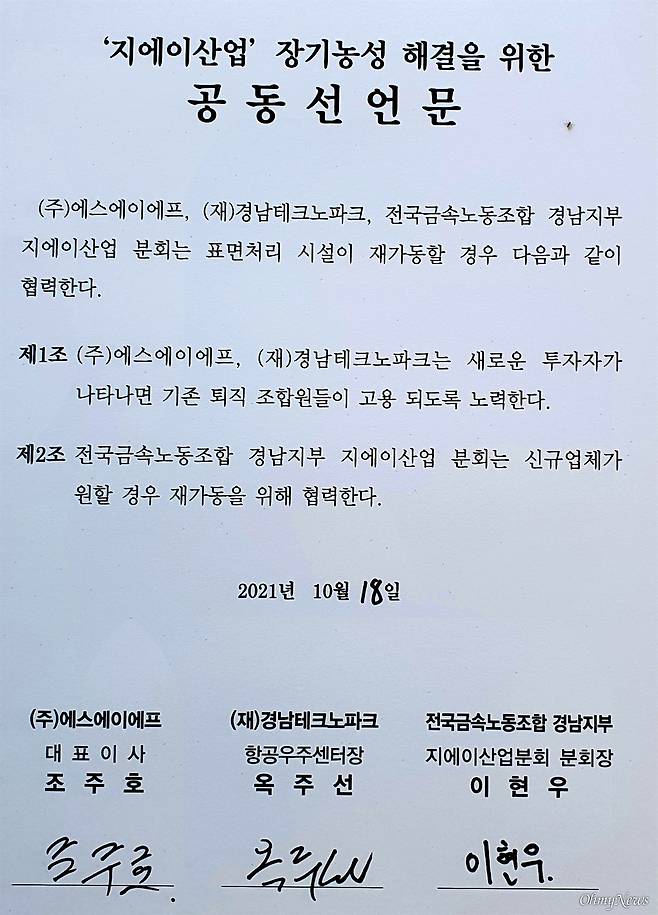 이들은 추후 표면 처리 시설 재가동과 관련해 "에스에이에프, 경남테크노파크는 새로운 투자자가 나타나면 기존 퇴직 조합원들이 고용되도록 노력하고, 지에이산업분회는 신규업체가 원할 경우 재가동을 위해 협력한다"고 합의했다.