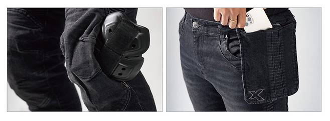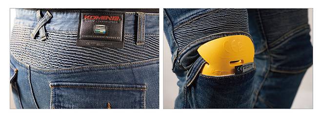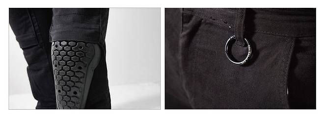 캐주얼한 스타일의 슬림핏 라이딩 진. 내마모성이 강하다고 알려진 Armalith®의 초고분자량 폴리에틸렌UHMWPE 섬유를 사용하여 안전성을 높였다. 입었을 때 보호대가 들어간 게 티가 나지 않아 좋았다. 겉보기는 캐주얼한 면바지 느낌이기에 라이딩과 일상생활에서 모두 착용 가능하다.