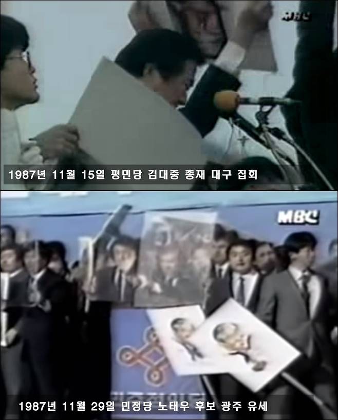 | ▲ 1987년 11월 15일 평민당 김대중 총재의 대구 집회와 11월 29일 민정당 노태우 후보 광주 유세. 노태우 후보는 돌이 날아올 것을 알고 미리 방탄유리를 준비하기도 했다. |