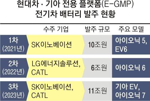 SK이노베이션은 1차 발주에서 10조원 규모의 현대차 아이오닉 5, 기아 EV6 배터리를 수주한 데 이어 3차 발주에서도 9조원치를 확보하게 됐다. LG에너지솔루션은 6조원 규모의 2차 발주 물량을 중국 CATL과 공동 수주하는 데 그쳤다.