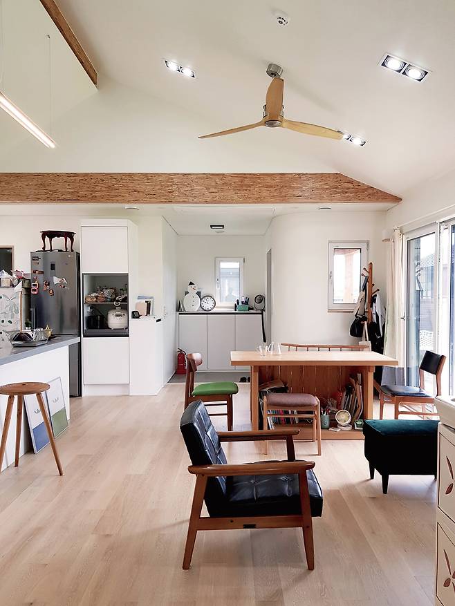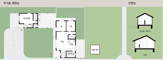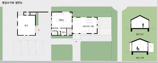 주택의 기능을 확장할 수도 있고, 빵집의 기능을 확장할 수도 있게 구성되었다. 도로변과 빵집에서 독립적으로 진입이 가능하고, 주택 마당으로도 연결이 가능하다. 때로는 서재로, 때로는 갤러리로, 때로는 체험공간으로 사용될 수 있는 변화무쌍한 여러 가능성을 지닌 공간으로 작용하게 될 것이다. 빵집은 어머니의 공간이고, 창고는 아버지의 공간인 셈이다.