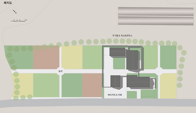 우선 인지성과 도로와의 관계를 바탕으로 설정된 빵집 부지, 그리고 동쪽의 들과 산을 품으며 빵집의 뒤편으로 조성된 주택 부지를 계획하였다. 가능하면 기존 마을과의 적절한 거리를 유지하면서도 혹시나 주민들에게 불편을 끼치지는 않을까 연심 고심하며 빵집과 주택의 부지를 계획하였고, 들과 마을 풍경에 좀 더 자연스럽게 스며들 수 있도록 건물의 크기와 형태 그리고 관계를 생각하는 본격적인 설계가 시작되었다.
