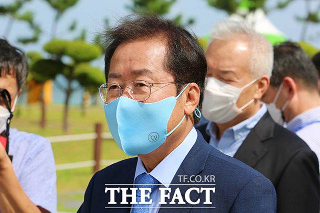 국민의힘 대선 경선 후보인 홍준표 의원(가운데)이 6일 강원도 강릉시 정동진 모래시계 공원을 찾아 취재진과 인터뷰하고 있다.