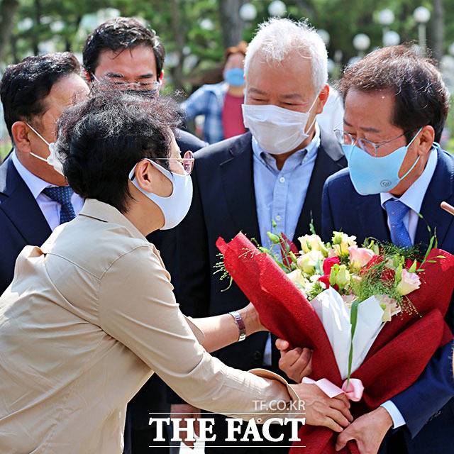 [더팩트ㅣ남윤호 기자] 국민의힘 대선 경선 후보인 홍준표 의원(가운데)이 6일 강원도 강릉시 정동진 모래시계 공원을 찾아 취재진과 인터뷰하고 있다.