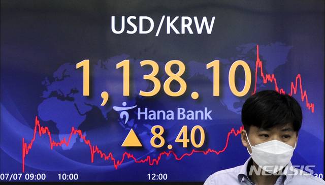 [서울=뉴시스] 정병혁 기자 = 서울 외환시장에서 원·달러 환율이 전 거래일(1131.5원)보다 8.4원 오른 1138.1원에 마감한 7일 오후 서울 중구 하나은행 딜링룸에서 딜러들이 업무를 보고 있다. 이날 코스피는 전 거래일(3305.21)보다 19.87포인트(0.60%) 내린 3285.34에, 코스닥지수는 전 거래일(1044.96)보다 2.40포인트(0.23%) 오른 1047.36에 마감했다. 2021.07.07. jhope@newsis.com
