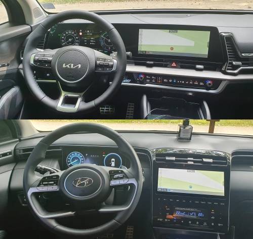 반면 투싼은 10.25인치 디지털 클러스터와 10.25인치 인포테인먼트 시스템 화면이 분리 적용돼있어 스포티지보다 시선 분산이 많을 수밖에 없다. 특히 인포테인먼트 시스템 화면의 경우 화면 왜곡을 줄이기 위해 비스듬히 적용됐으나 클러스터보다 낮아 운전 중 제대로 보기가 어렵다.