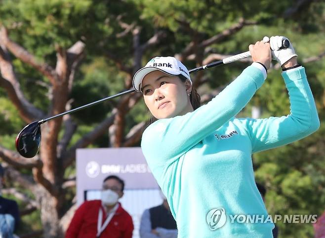 (부산=연합뉴스) 조정호 기자 = 23일 부산 기장군 LPGA 인터내셔널 부산에서 열린 미국 여자프로골프(LPGA) 투어 BMW 레이디스 챔피언십 3라운드에서 이민지가 드라이브샷을 하고 있다. 2021.10.23