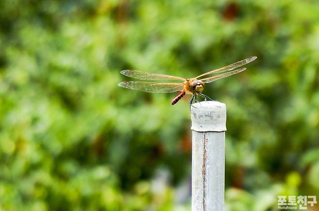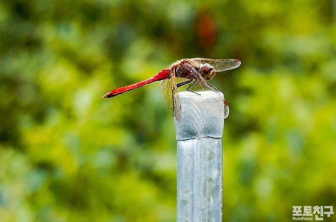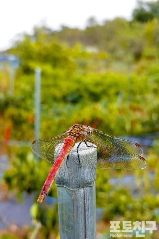 고추잠자리가 고추밭에서 여기저기 고추 지지대를 놀이터 삼아 가을을 즐기고 있습니다.