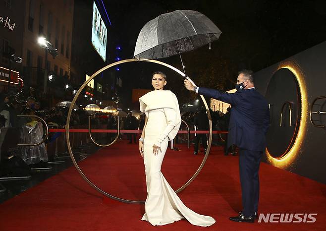 [런던=AP/뉴시스] 배우 젠데이아 콜먼이 18일(현지시간) 영국 런던에서 열린 영화 '듄' 시사회에 도착해 포토타임을 갖고 있다. 2021.10.19.
