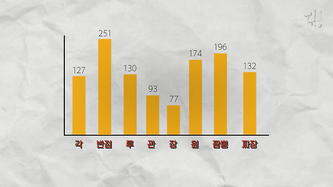 모아보니 서울만 해도 중식당이 무려 3400곳. 이것도 양꼬치랑 마라탕 전문점은 빼고 계산한 거다. 취재대행소 왱은 이 중에서 ‘각(閣)’ ‘반점(飯店)’ ‘루(樓)’ ‘원(園·院)’ ‘장(莊)’ ‘관(館)’이 포함된 식당을 글자별로 집계해봤다. 요즘 00짬뽕, 00짜장 체인점도 많은 것 같아서 이것도 별도로 분류했다.
