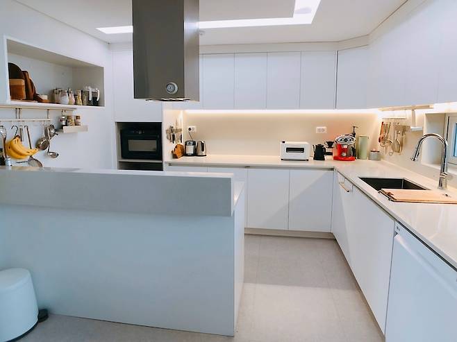 그 아이가 바로 이 주방 오른쪽 구석에 있는 식기세척기예요. 흰색이라서 얼핏 보면 잘 모르겠죠?