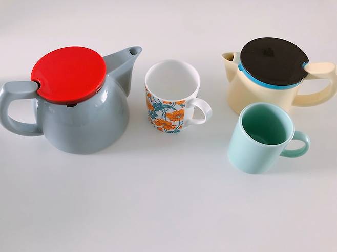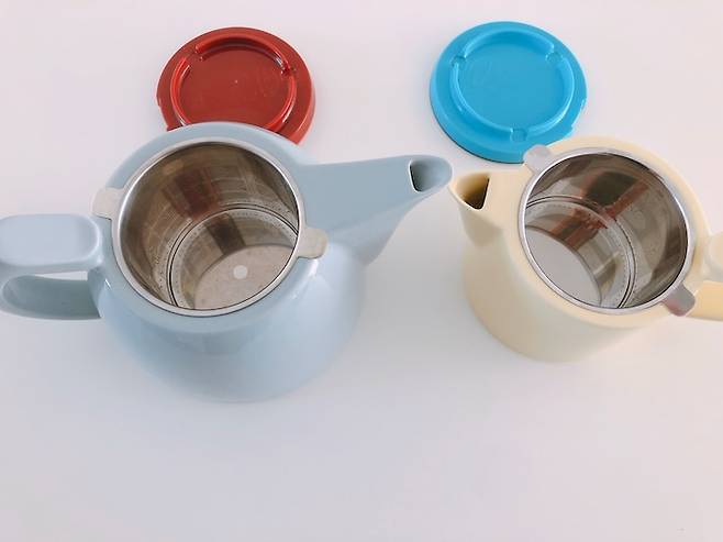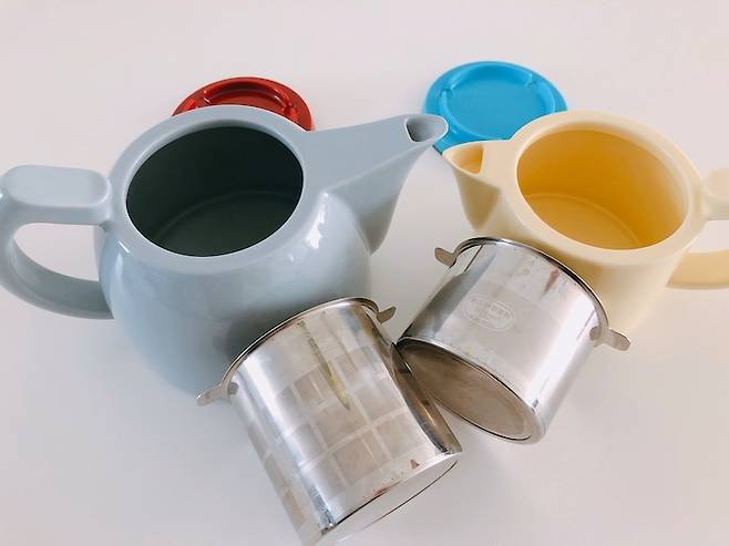우선 파란색 큰 티팟은 옥수수차 전용 저그로 잘 쓰고 있어요. 꼬맹이들이 생수보다 끓인 차를 좋아해서 매일은 아니어도 생각날 때마다 옥수수 알 넣고 뜨거운 물 부어놓음 되니깐 간편하더라구요.
