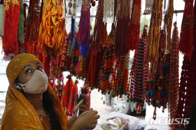 [아마다바드=AP/뉴시스] 20일(현지시간) 인도 아마다바드의 한 상점에서 한 여성이 '락샤반단' 축제를 앞두고 성스러운 실 팔찌 '라키'를 사고 있다. '락샤반단'은 '보호'를 뜻하는 '락샤'와 '묶는다'는 뜻의 '반단'이 합쳐진 말로 이날 남매가 서로의 손목에 '라키'를 걸어주며 우의를 다지는데 올해는 22일이 '락샤반단' 축제일이다. 2021.08.20.