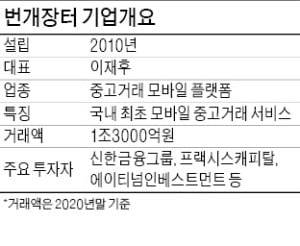이재후 전 티몬 대표가 이끌고 있는 번개장터는 2010년 문을 연 뒤 현재 당근마켓, 중고나라와 함께 중고거래업계 ‘빅3’로 불린다. 간편 안전결제 서비스인 ‘번개페이’, 픽업·포장·배송 서비스를 제공하는 ‘번개장터 포장택배’ 등으로 차별화에 나서고 있다. 거래액은 지난해 1조3000억원을 기록했고, 올해는 거래액 1조4000억원에 거래 건수는 1400만 건을 넘겼다. 가입자 수는 1600만 명을 웃돈다. 지난해 매출은 140억원 수준이다.