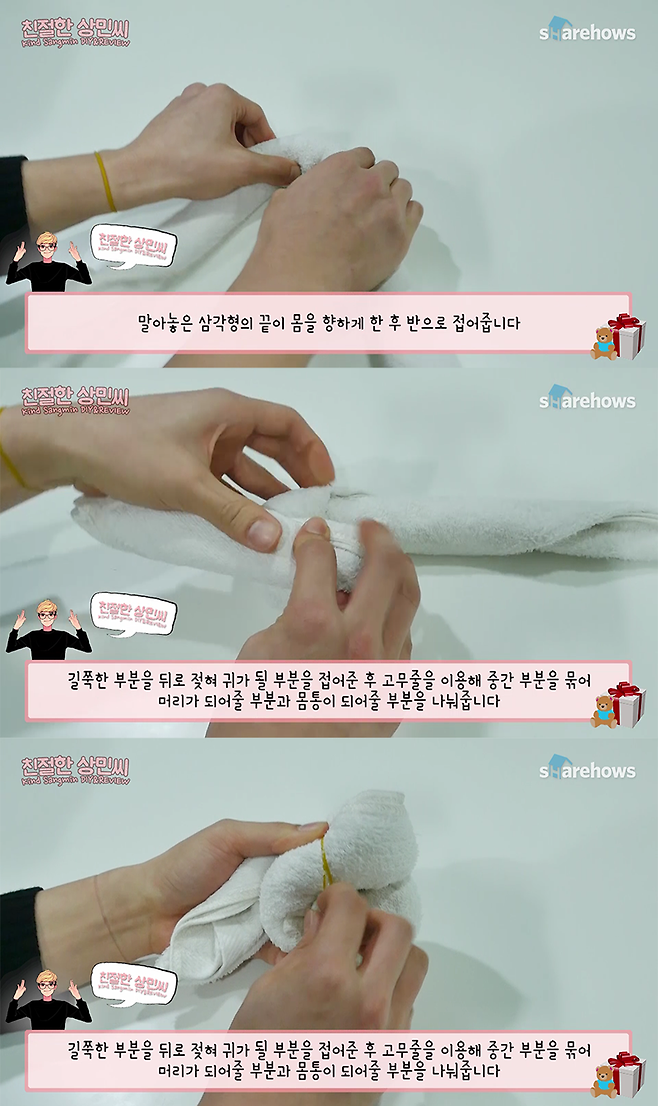 2. 수건을 만 후 수건의 모서리가 있는 면을 몸통쪽으로 향하게 한 후 수건을 반으로 접고 길쭉한 부분을 뒤로 접어 고무줄로 고정해줍니다.