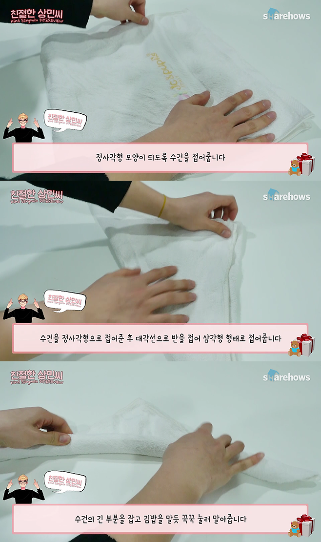 1. 수건을 정사각형 모양으로 반 접고 세모 모양으로 한번 더 접은 후 단단하게 꼭꼭 말아줍니다.