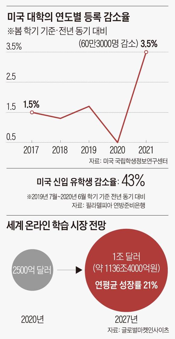 신종 코로나로 원격 비대면 수업이 보편화하면서 온라인 학위에 대한 사회적 거부감도 크게 낮아졌다. 컬럼비아대 교육연구센터의 피오나 홀랜즈 선임연구원은 “(신종 코로나는) 온라인에 참여하고 싶지 않은 사람도 참여하게 하고 있다”며 “온라인 학위와 실제 학위의 경계가 점차 흐려질 것”이라고 내다봤다. 시장조사기관 글로벌마켓인사이츠는 세계 온라인 학습 시장 규모가 지난해 2500억달러(약 284조원)를 초과했고, 2027년에는 1조달러(약 1136조원)에 도달할 것으로 전망했다.