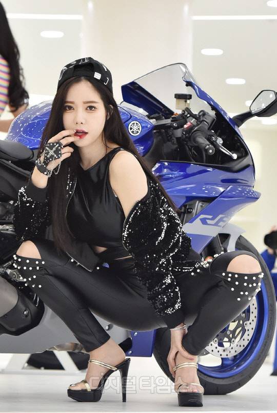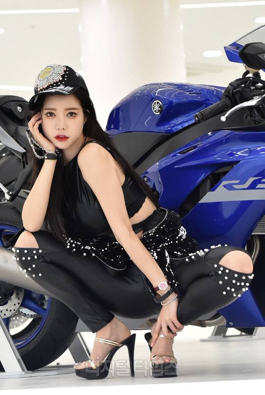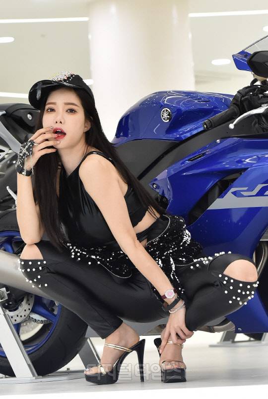 레이싱모델 한민영이 대전시 대덕구 야마하중부지원센터에서 열린 '온라인 모터쇼'에서 포즈를 취하고 있다.