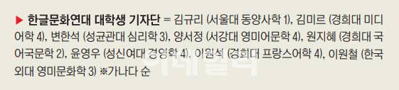 [이데일리 윤종성 기자] 이데일리는 ‘우리말, 생활 속으로’ 기획의 일환으로 한글문화연대 대학생 기자단과 함께 외국어를 우리 말로 다듬는 작업을 진행했다. 인터넷, SNS(사회관계망서비스) 사용이 잦은 Z세대(1990년대 중반~2000년대 초반 출생)의 의견을 청취해 젊은 감각으로 대체어를 만들어 보고, 그 과정에서 우리 말이 더 널리 쓰일 수 있는 단서를 찾아보기 위해서다. 대학생 기자단과 만남은 지난 7월 6일과 22일 두 차례에 걸쳐 서울 중구 KG타워 회의실에서 이뤄졌다. <편집자 주>