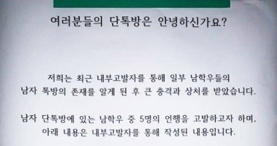 2019년 11월 8일 청주교대 본관과 체육관에는 “여러분들의 단톡방은 안녕하신가요?”라는 대자보가 붙었다. 대자보 작성자는 “남자 단톡방에 있는 남학우 중 5명의 언행을 고발하고자 한다”며 단톡방에서 오갔던 대화를 발췌해 게시했다. 가해자들은 단톡방에서 동기 여학생의 사진을 올린 후 외모를 비하하거나 성적 대상화 하는 대화를 반복한 것으로 나타났다. 3만원을 걸고 여학생 외모 투표를 벌이기도 했다. 가해자들이 예비 초등 교사라는 점에서 더 큰 충격을 준 사건이었다.