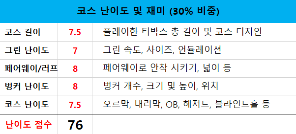 중급자에서부터 비기너까지 재밌게 즐길 수 있는 (화이트 티) 코스입니다. 상급자 및 장타자에게는 쉽게 느껴질 수 있으니 챔피언 또는 블랙 티를 권해드립니다. 또한, 그린 속도가 조금 더 빨랐다면 난이도 역시 상승했을 거라고 생각합니다.