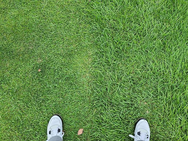 라운드 이틀 전부터 당일 새벽까지 천둥번개 쳐대며 쏟아지는 비 때문에 잔디를 제대로 깎을 겨를이 없었나 보네요. 아쉽게도 그린이 상당히 느린 상태였습니다.