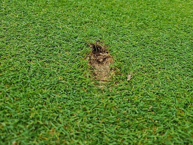 폭풍으로 인해 엄청난 양의 비가 내렸음에도 그린 위에 물기를 찾아볼 수 없을 정도로 배수는 잘 되는 것 같습니다. 그러나, 캐디님에 의하면 평소 컨디션에 비해 엉망이라고 하네요. 그린 보수기로 표면을 찔러보니 잔디 뿌리가 깊지 않아서 그런지 매우 푸석한 느낌이 났습니다.