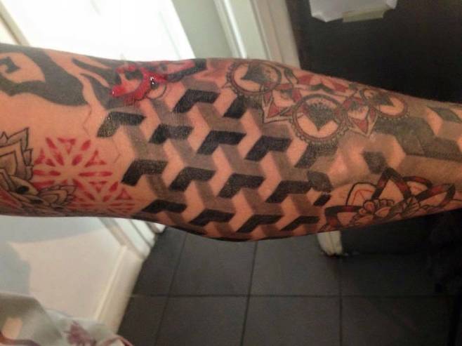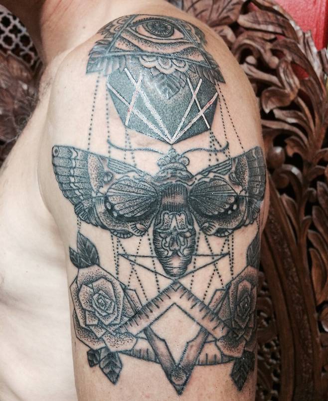 토타 볼페 랜디: 친구에게 해준 타투가 가장 기억에 남아요. 기존 친구의 타투를 다른 모양으로 바꿔줬거든요. 점묘법으로 일루미나티와 석공 기호 가운데 나방을 그렸죠. 팔에 흑백으로 작업했어요. 기하학 문양이나 연금술에 관심 많아서 작업하면서 즐거웠죠. 7시간이나 걸려서 몇 회에 나눠서 했어요.
