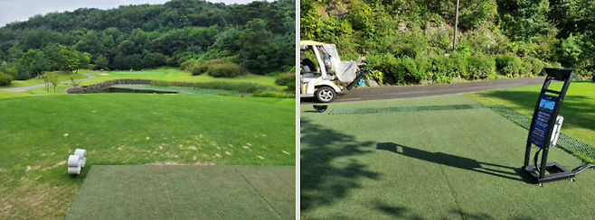 티 박스 상태가 애매한 편입니다. 홀에 해당하는 숫자로 만든 티 마커가 인상적이었지만 인조 매트가 많은 편이고, 매트 자체도 많이 낡은 상태입니다. 2~3개 티 박스 뒤에 사진을 찍는 장치도 있었는데 이날은 작동을 하지 않더군요.