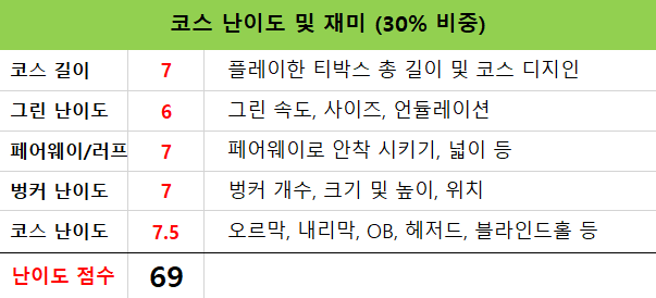 개인적인 생각으로 골프존 이름이 들어간 골프장은 대체로 무난하게 느껴지는듯합니다. 난이도를 포함한 대부분 면에서 평균적이라고 해야 할 것 같네요. 높은 난이도로 지능적인 플레이를 지향한다고 소문 들었지만 중급 골퍼에게도 큰 부담은 없을 것으로 생각합니다.