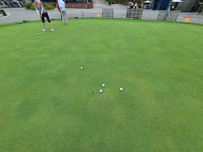 일주일 전에 다녀온 지인이 그린이 빠른 편이라고 해서 기대했는데, 그 사이 약간 느려졌나 보네요. 그래도 공 굴리기에 큰 문제가 없는 2.5M 그린 속도였습니다.