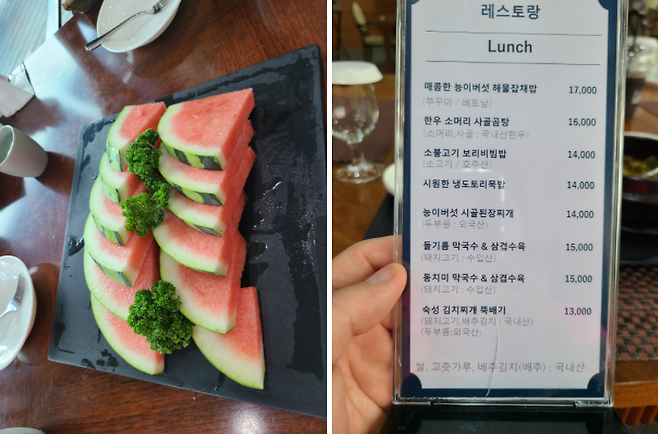 전반 후, 약 20분 쉬면서 먹은 수박. 아침 식사로 먹은 능이버섯 된장찌개 맛도 좋았습니다.
