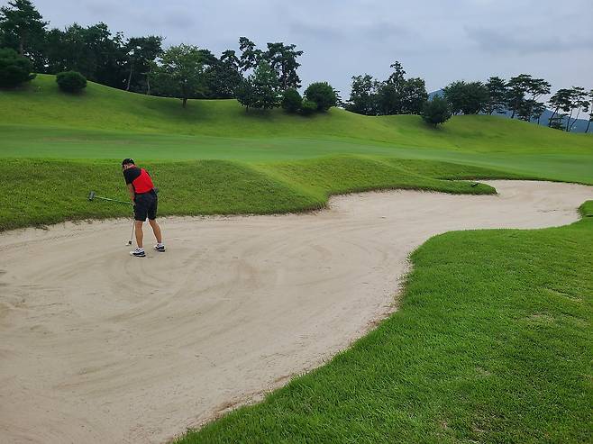요즘 신경 써서 보는 부분은 1부 티티임이면 전날 플레이 후 관리팀에서 모래를 모두 다졌는지, 앞팀들이 샷 한 후 벙커 정리했는지 등. 코스 측에서 관리를 잘한 느낌이 듭니다만, 아직 골퍼들의 뒷정리가 아쉽습니다.