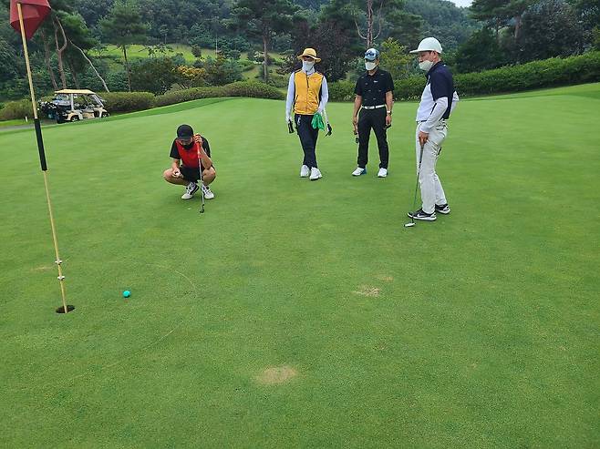 연습 그린 속도가 실제 그린 속도보다 약간 더 빨라서 첫홀에 살짝 당황했습니다.