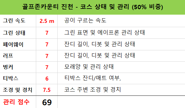 페어웨이 및 러프 관리는 평균 이상인 홀과 이하인 홀들이 있더군요. 다행히, 코스 내 그린 속도는 모두 비슷합니다.