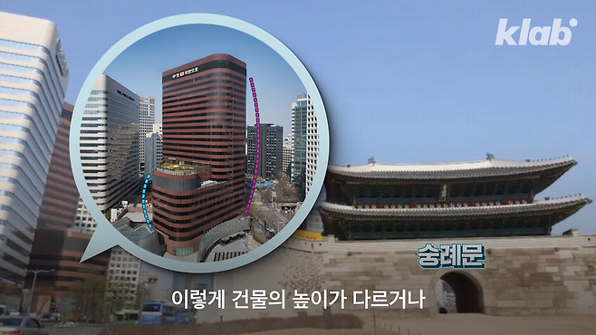 같은 건물인데 층고가 다르거나 건물 상층이 잘린 듯한 모습을 볼 수 있습니다.
