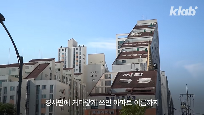 깎아 내려진 지붕 경사면에 커다랗게 쓰인 아파트 이름까지.
